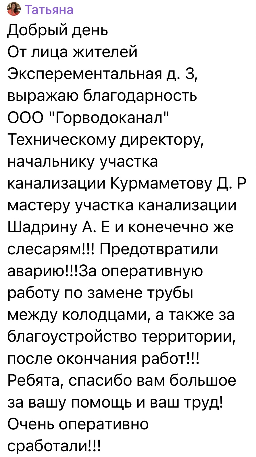 Оперативность реагирования на поступающие обращения и качество работ, выполненных специалистами Горводоканала, отметили жители дома № 3 на улице Экспериментальной. В социальных сетях одна из собственниц разместила комментарий с благодарностью, адресованной сотрудникам ресурсоснабжающей организации.