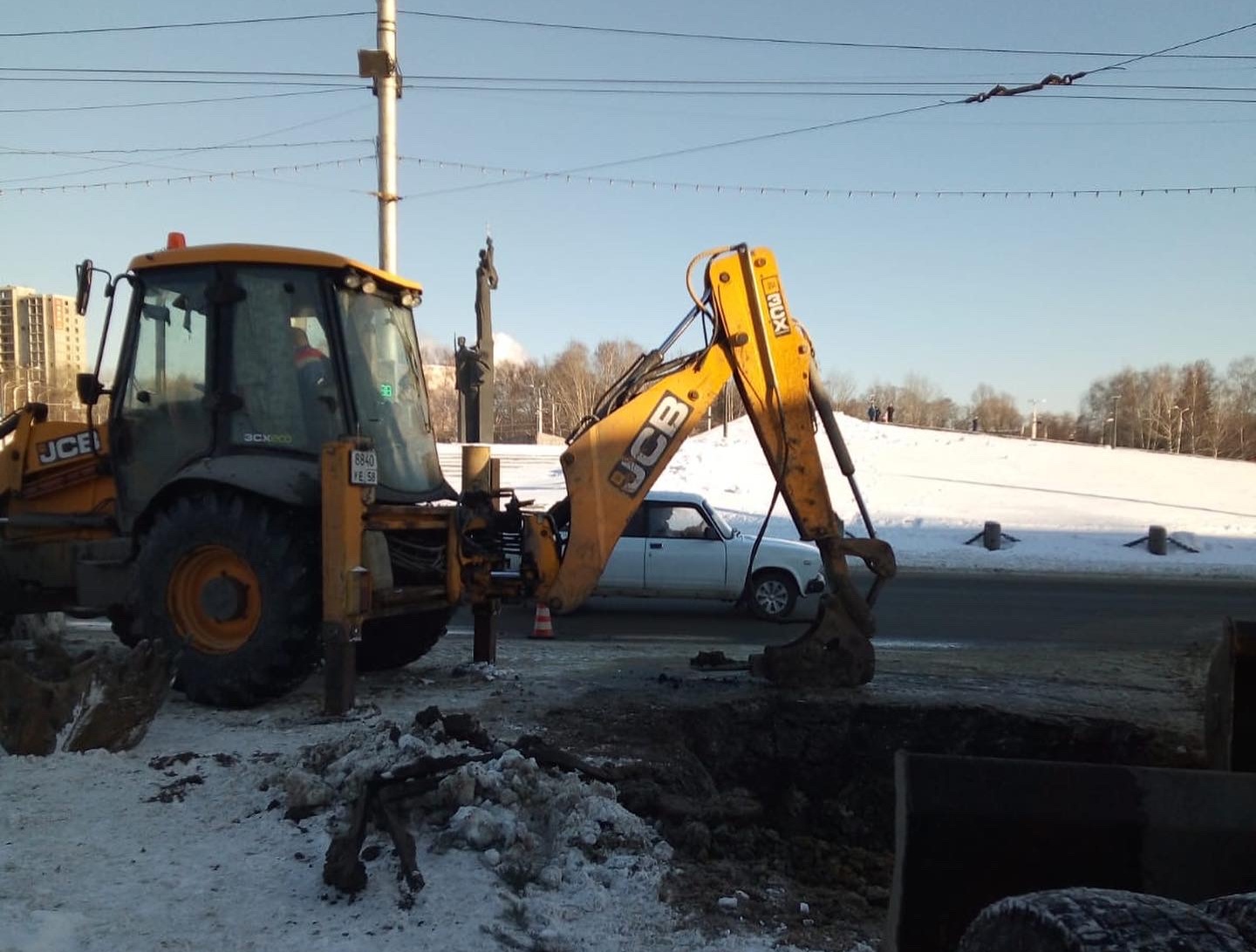 Параллельно с объектом аварийно-восстановительных работ пр. Победы, 69, ООО «Горводоканал» ведёт работы по устранению утечки на трубопроводе по ул.Карпинского/пр. Победы. Здесь произошёл разлом трубопровода диаметром 600 мм из-за смещения грунта, спровоцированным перепадом температуры.