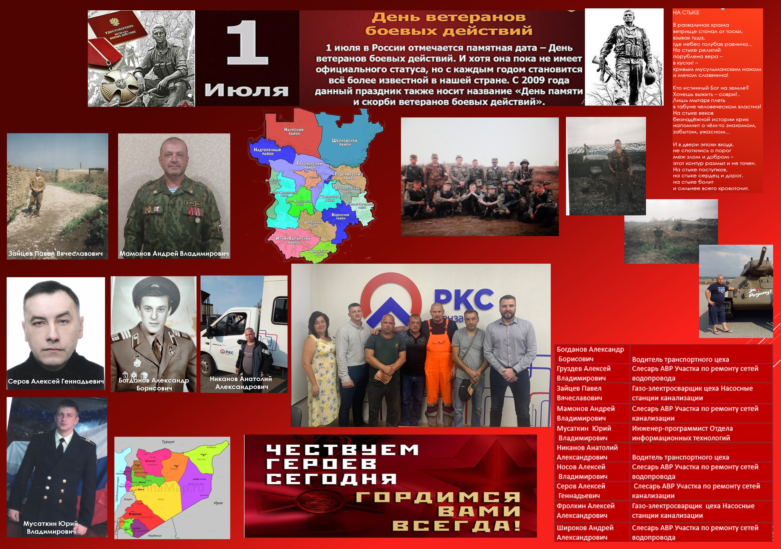 Сегодня, 1 июля, в России отмечается «День ветеранов боевых действий». Это день всех тех, чьи судьбы опалила война, кто с оружием в руках защищал свою Родину и выполнял свой воинский долг в мирное время. Среди сотрудников Горводоканала 15 героев, которые были участниками вооруженных конфликтов в Афганистане, Чечне, Сирии. Все они трудятся в разных отраслях предприятия – но их объединяет одно – мужество, честь и отвага!
