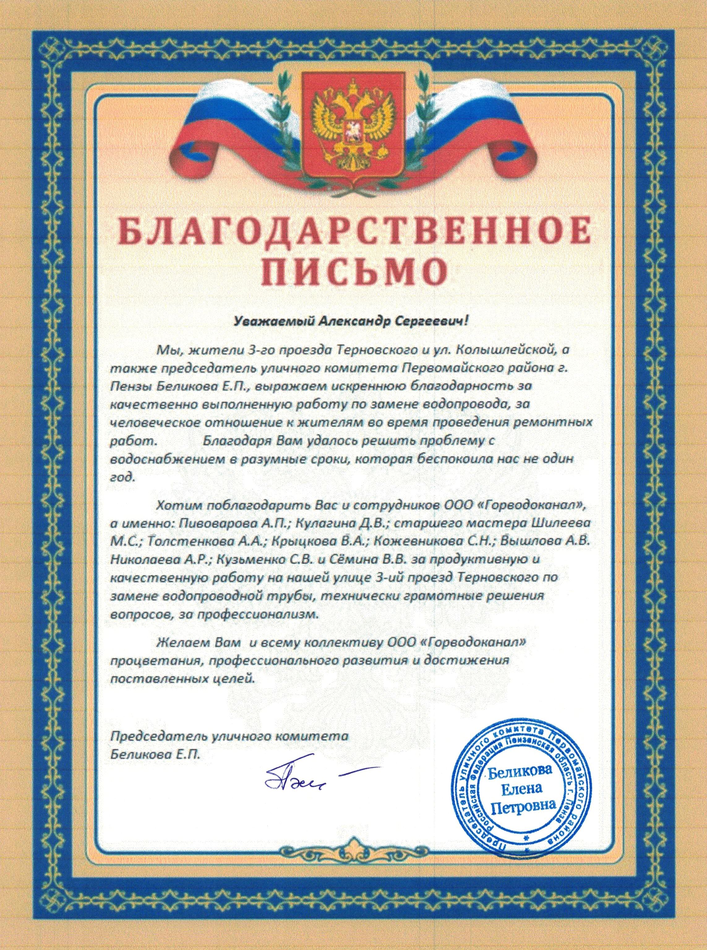 13 сентября в адрес ООО «Горводоканал» поступило письмо с благодарностью от жителей 3-го проезда Терновского и ул. Колышлейской. В своем обращении абоненты выражают слова благодарности Главному управляющему директору Александру Наголюку и всему коллективу компании за качественно выполненную работу по замене трубопровода и человеческое отношение к жителям: