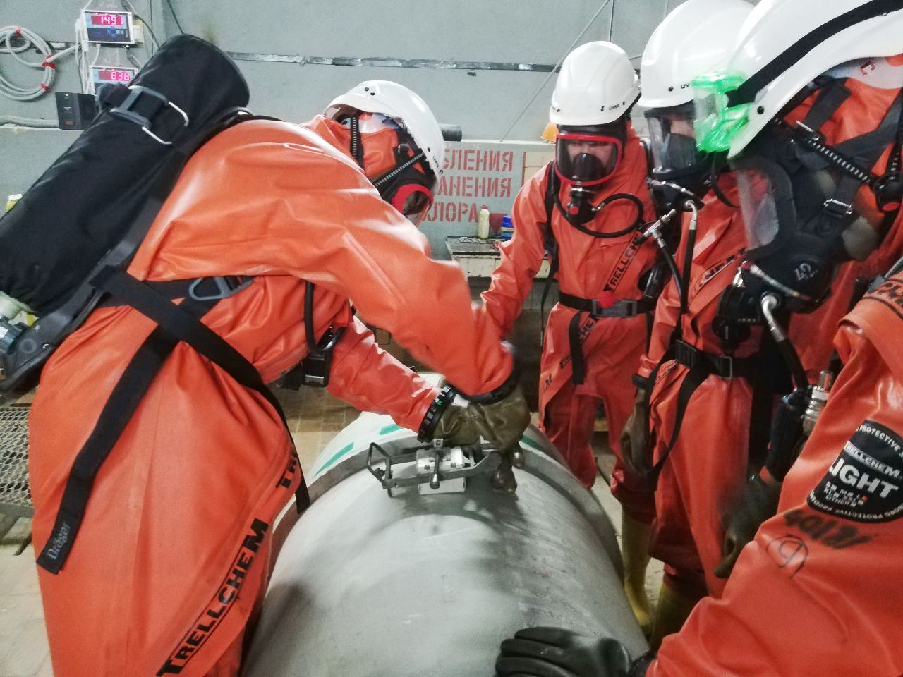 По легенде учений в цехе очистных сооружений водопровода при открытых въездных воротах при проведении разгрузочных работ произошло разрушение контейнера с хлором с полным истечением жидкого вещества в помещение.